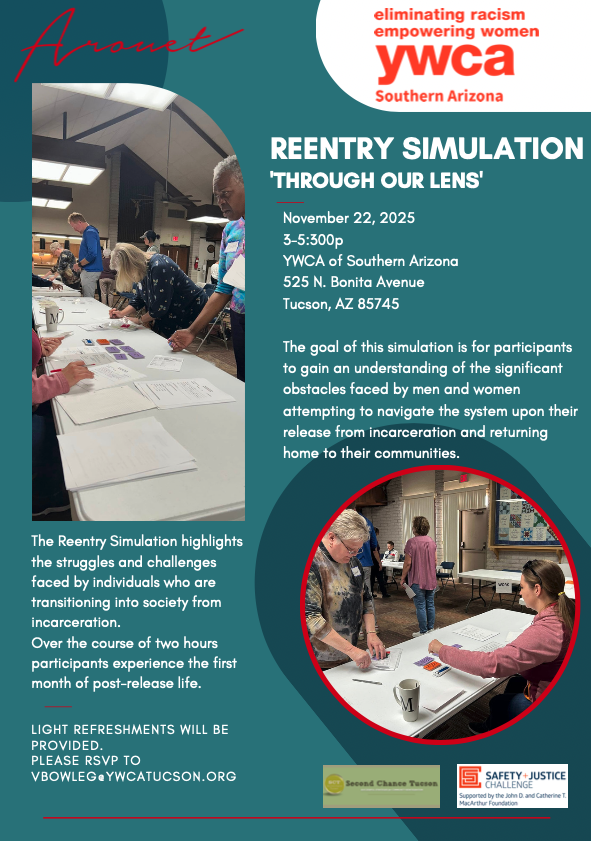 - YWCA of Southern Arizona Reentry Simulation ‘Through Our Lens’ on Saturday, November 22from 3-5:30pm at YWCA of Southern Arizona, 525 N Bonita Ave.