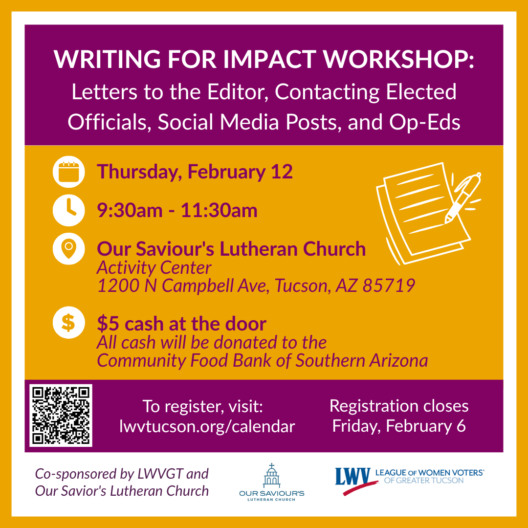 We LOVE advocacy. February 25th is Legislative Lobby Day at the Arizona State Capitol from 8:00am to 3:00pm. This is a chance to visit your state legislator’s office and attend a luncheon to hear updates on the current legislative session. To attend this exclusive opportunity for LWV members only, please email presidentlwvtucson@gmail.com by February 6th. We will carpool, or if there is enough interest, arrange for group transportation.